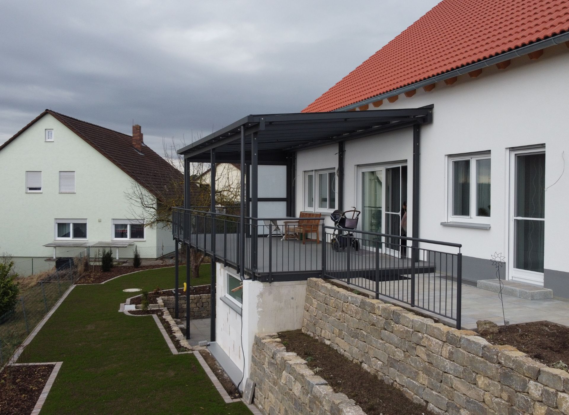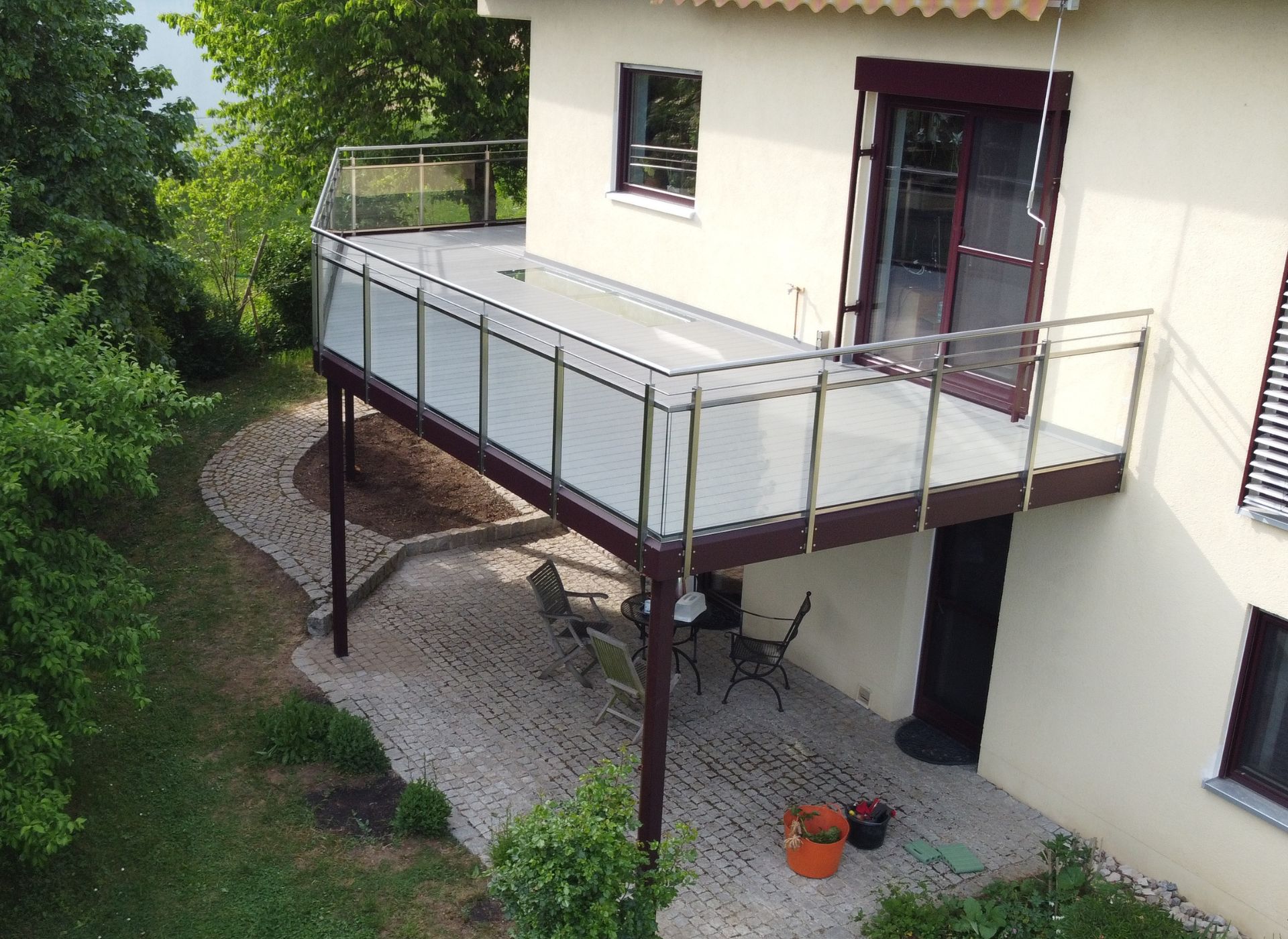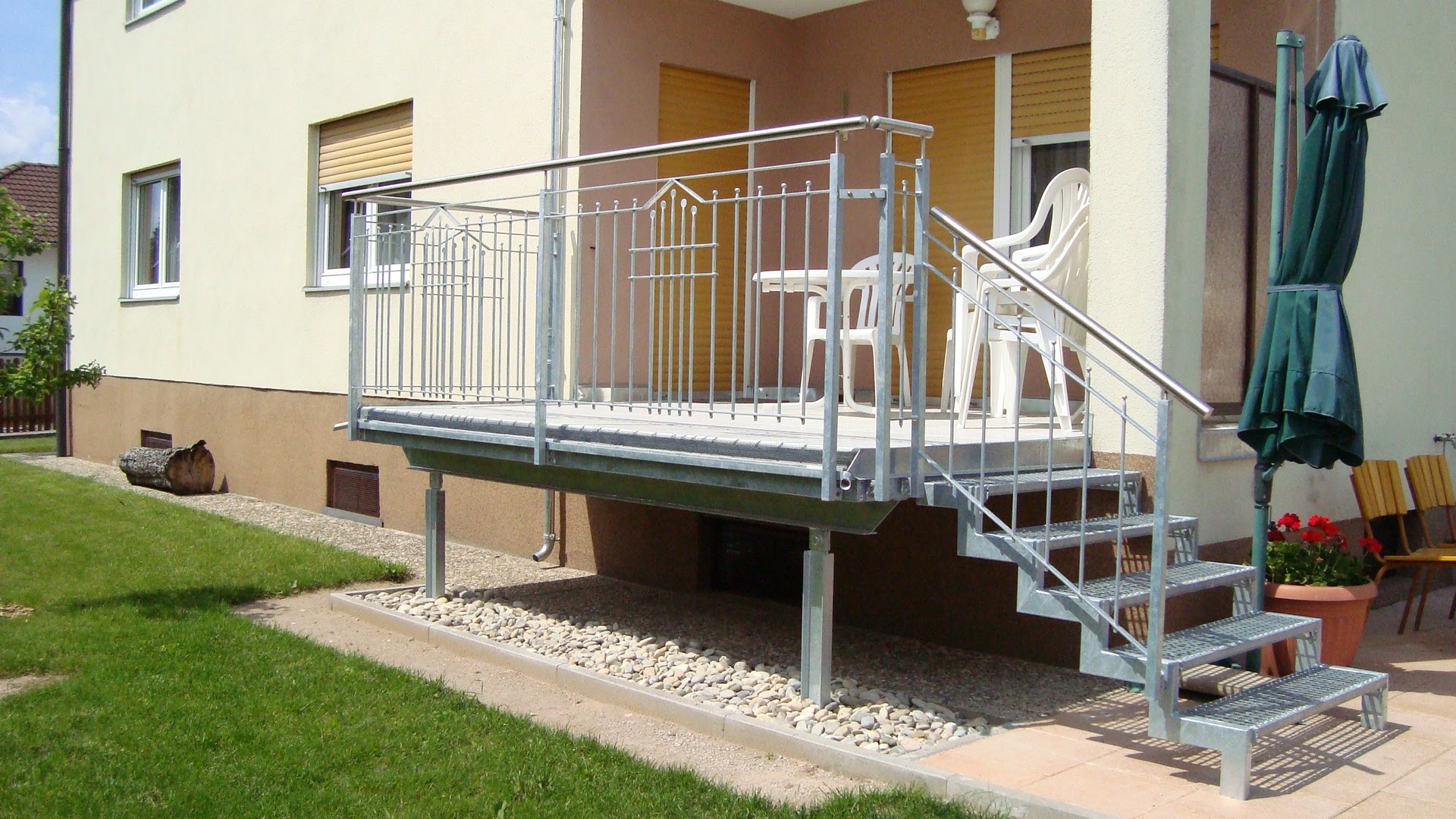- Gedenken Sie im Nachgang irgendwann eine Treppe in den Garten hinzufügen zu wollen? Nennen Sie unseren erfahrenen Konstrukteur einfach Ihre Wünsche. Wir fertigen dann das Geländer mit einem später, zerstörungsfrei entnehmbaren Teilstück und berücksichtigen die Lasten einer späteren Treppe direkt in der Konstruktion.