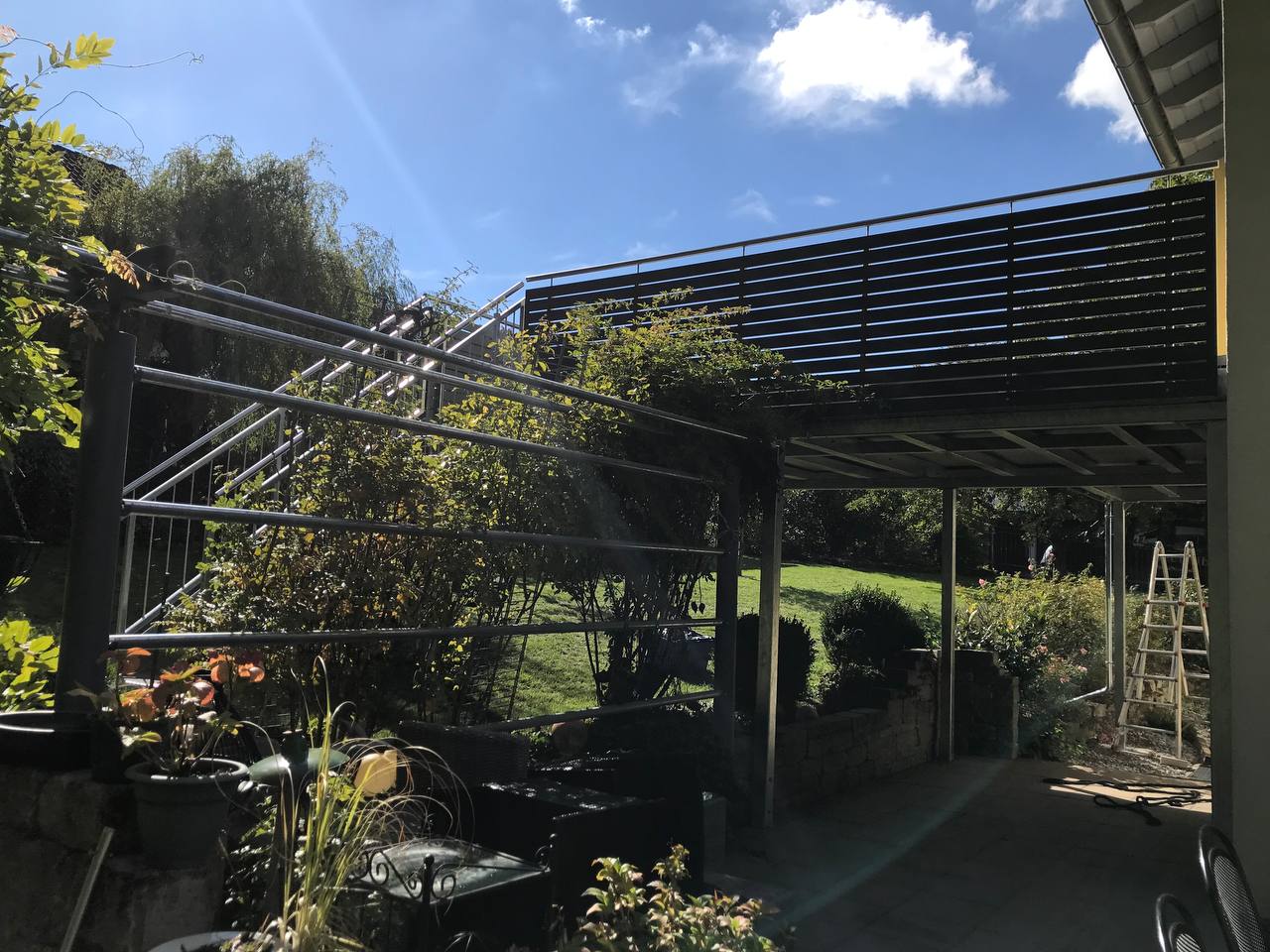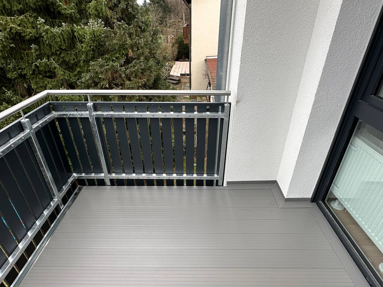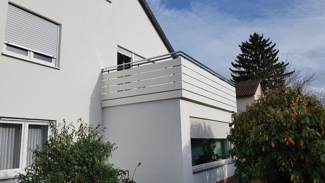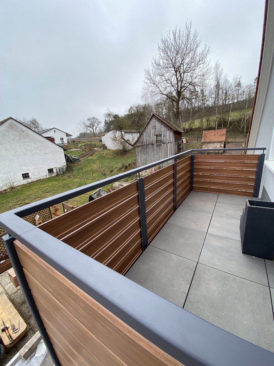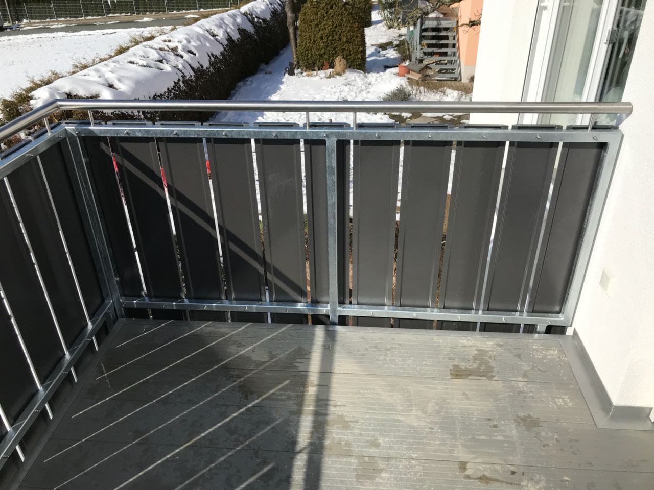 Das Geländer besteht aus einem feuerverzinkten (wahlweise pulverbeschichteten) Grundrahmen auf welchem senkrecht oder waagerecht Kunststoffprofile in RAL oder DB befestigt sind.