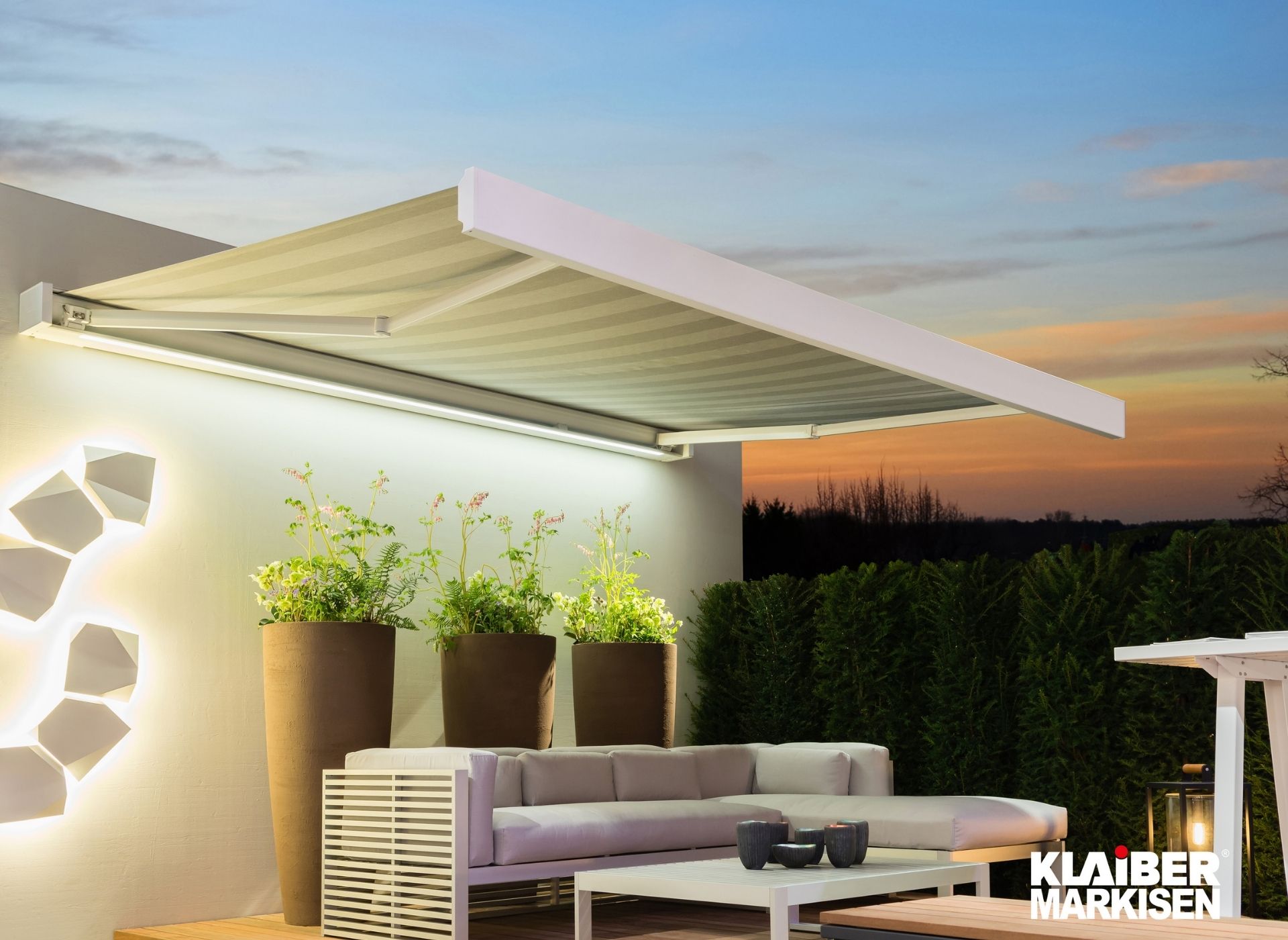 Für lange Terrassennächte hält sich die Wärme des Tages zu fortgeschrittener Stunde unter dem Markisentuch. Gleichzeitig vervollständigen sie den Stil von Haus und Terrasse. Denn Markisenform und -farbe lassen sich optimal auf die Fassade abstimmen.