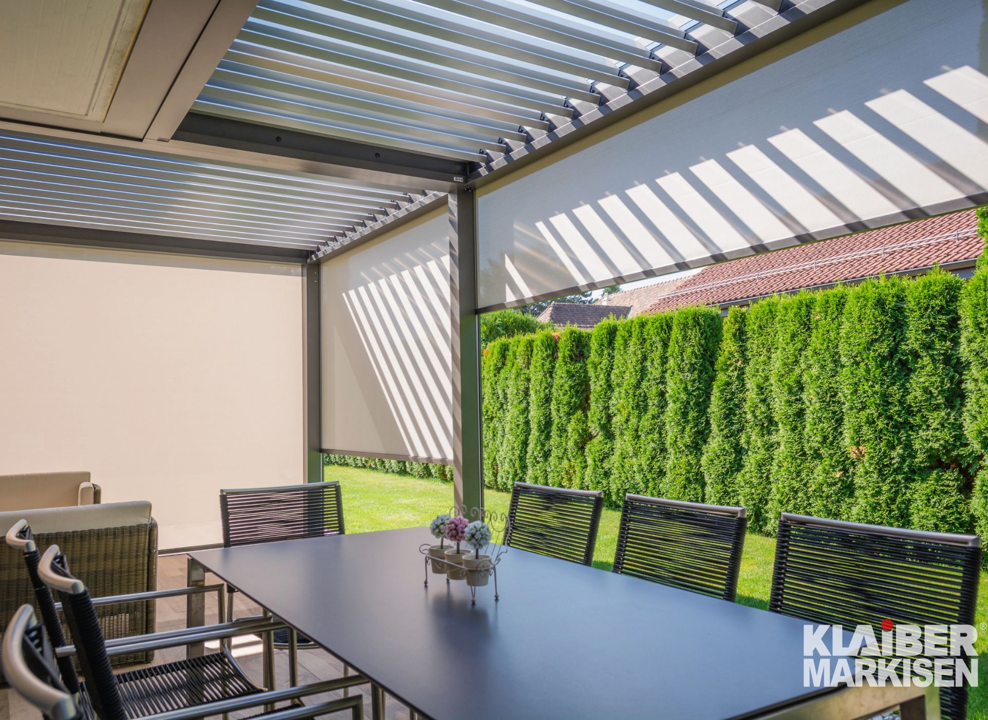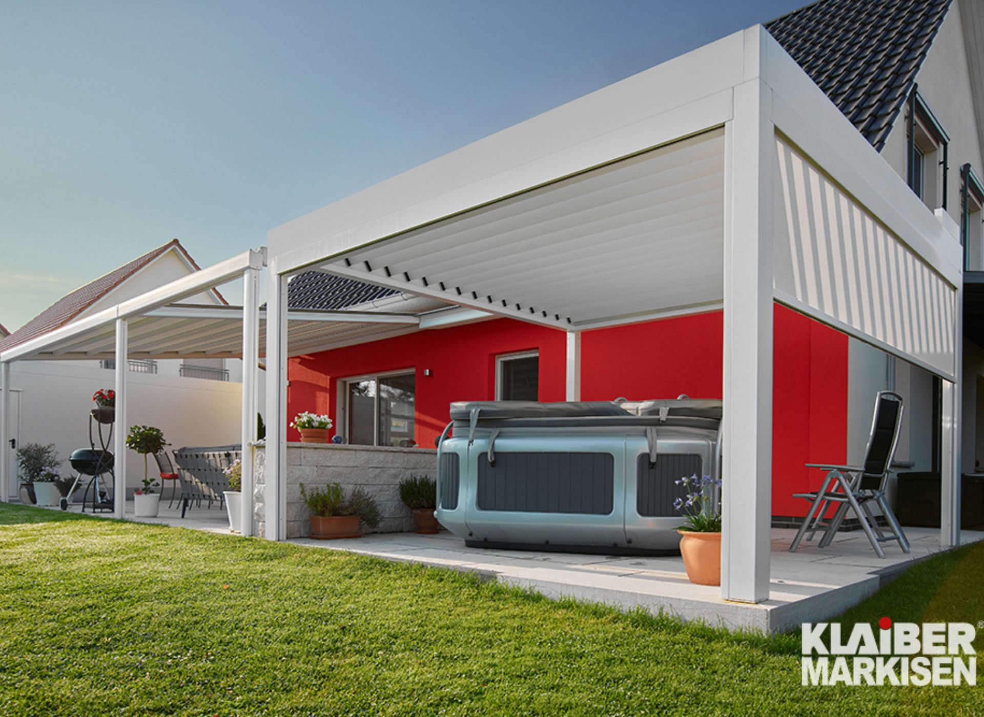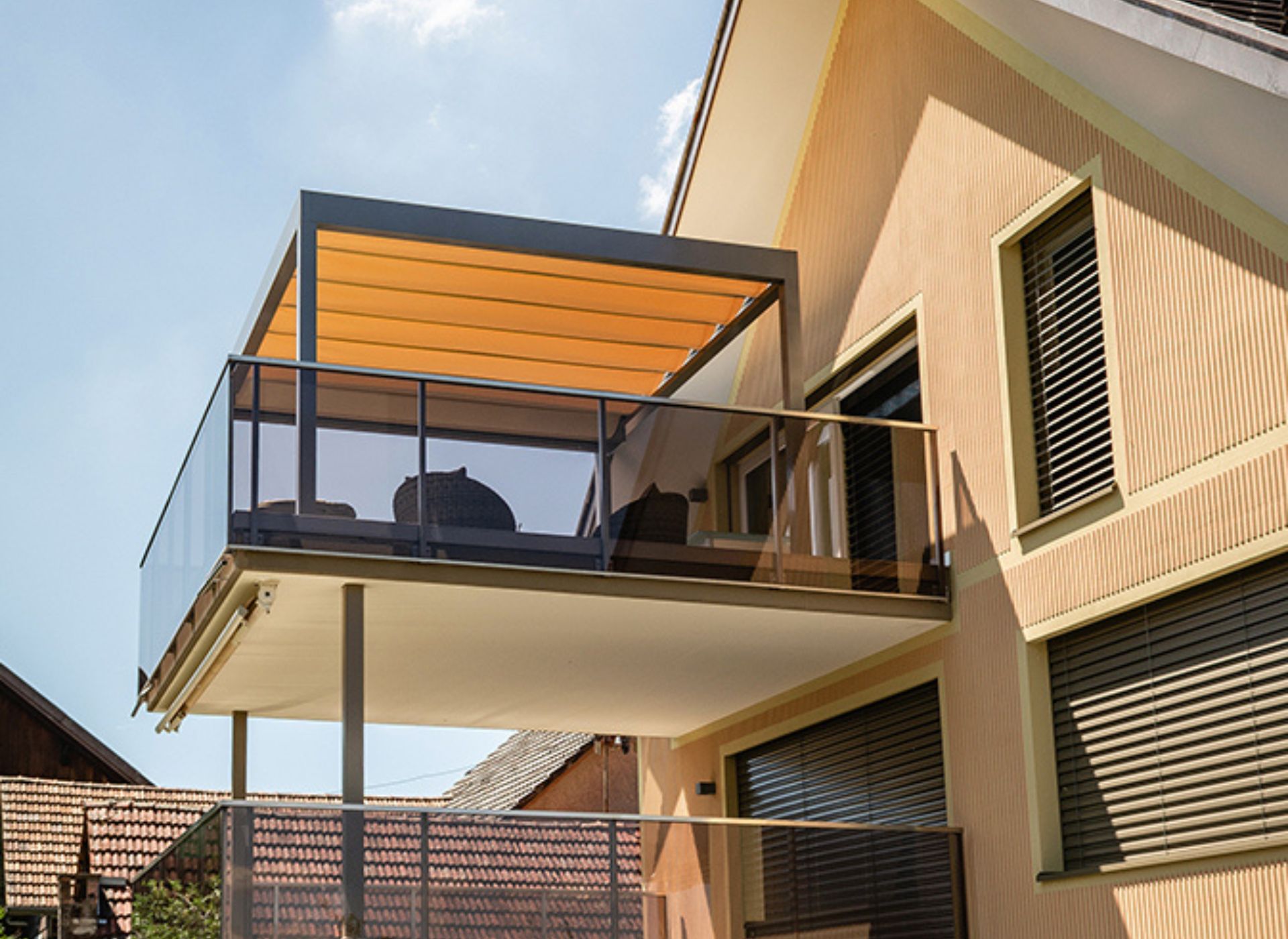 • Variabel neigbare Aluminium-Lamellen oder robuste Faltmarkise