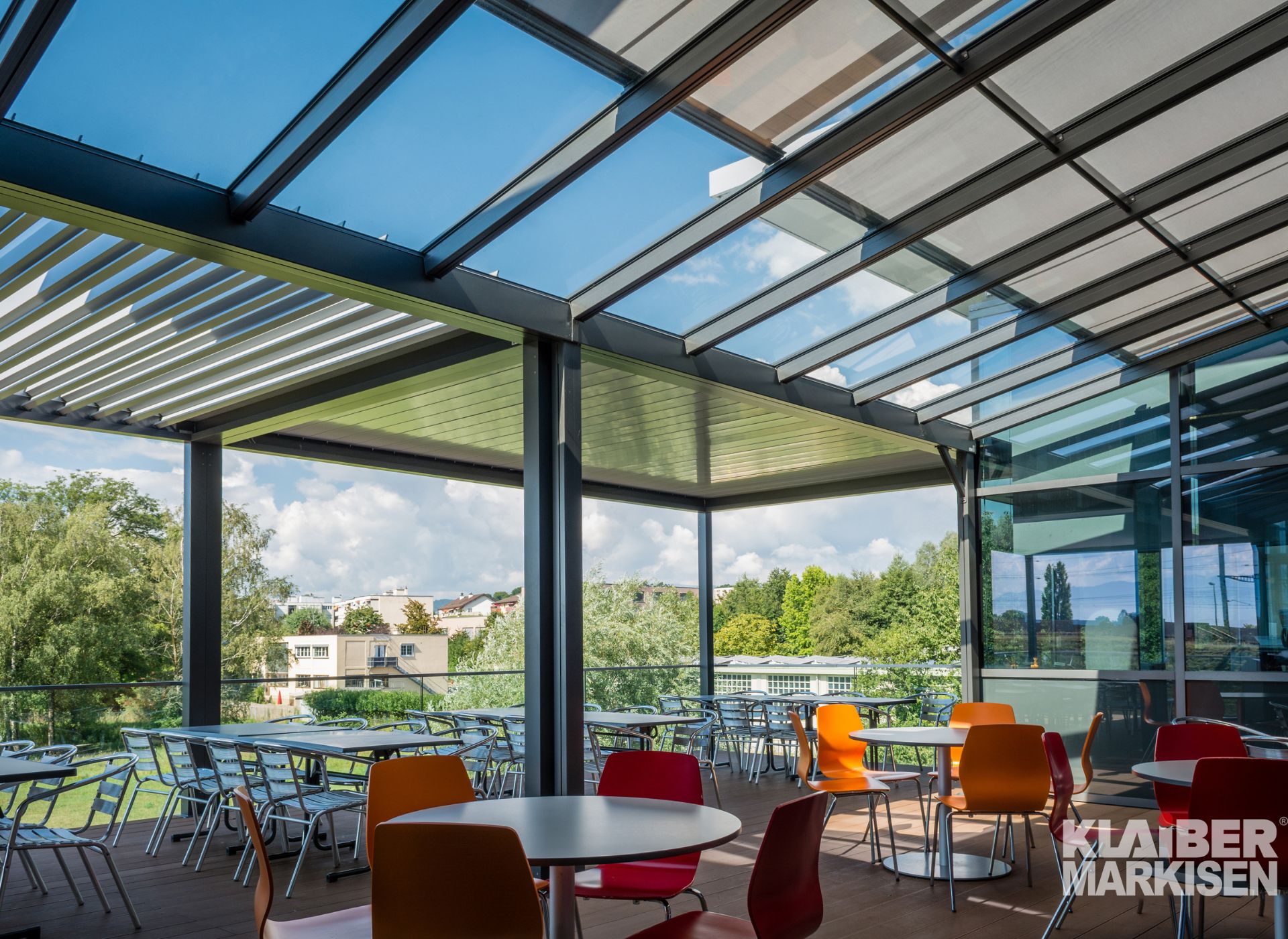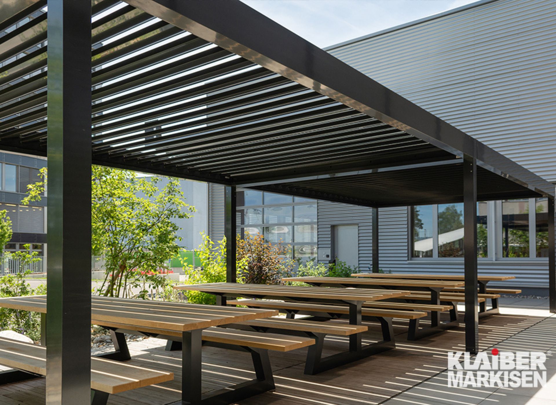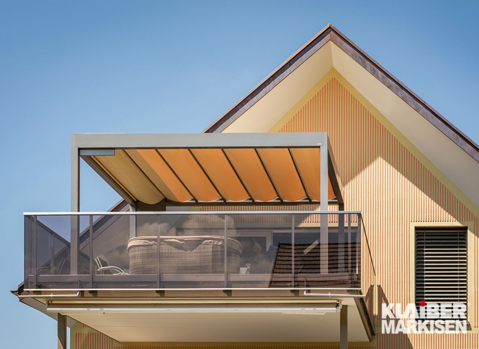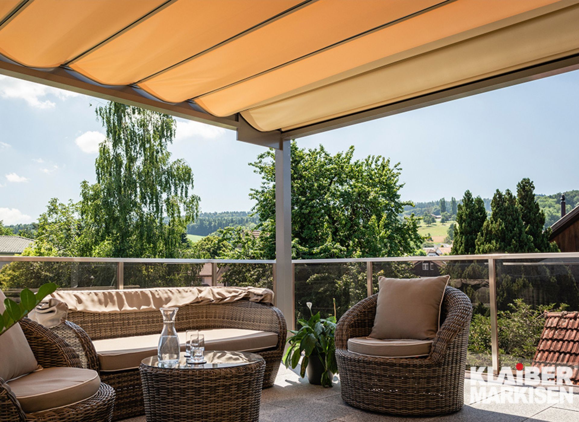 • Variabel neigbare Aluminium-Lamellen oder robuste Faltmarkise