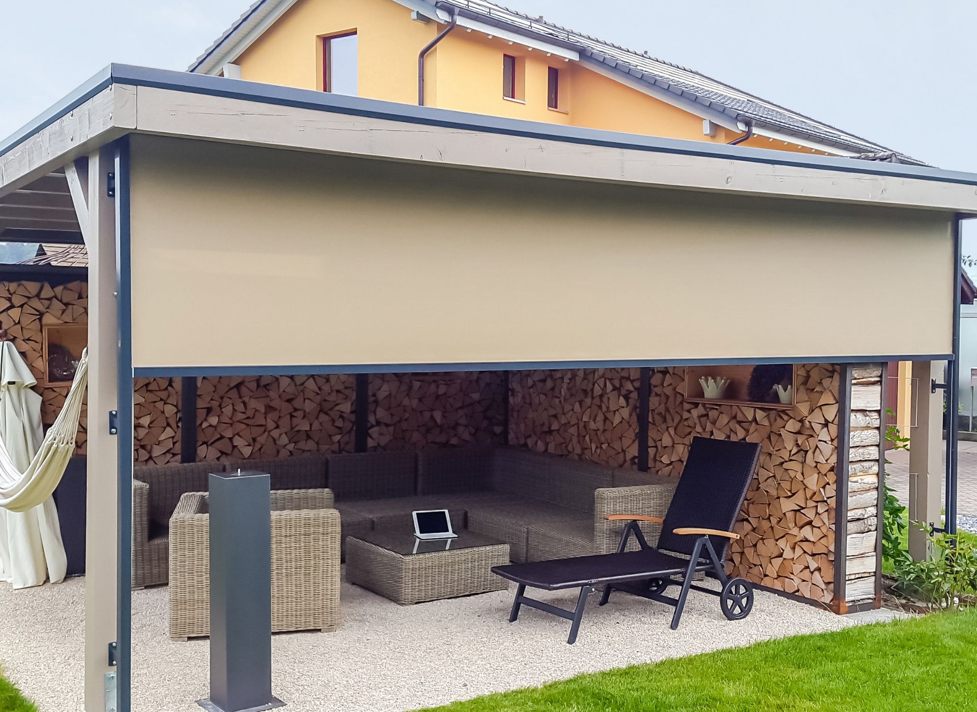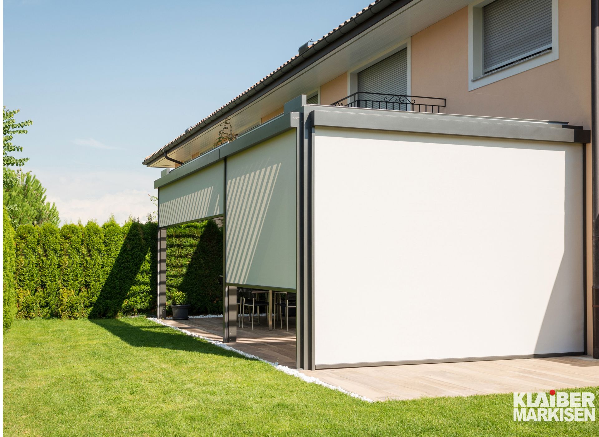 Die Senkrechtmarkise mit Reißverschlusssystem im kubischen Design für große Outdoor Lösungen.