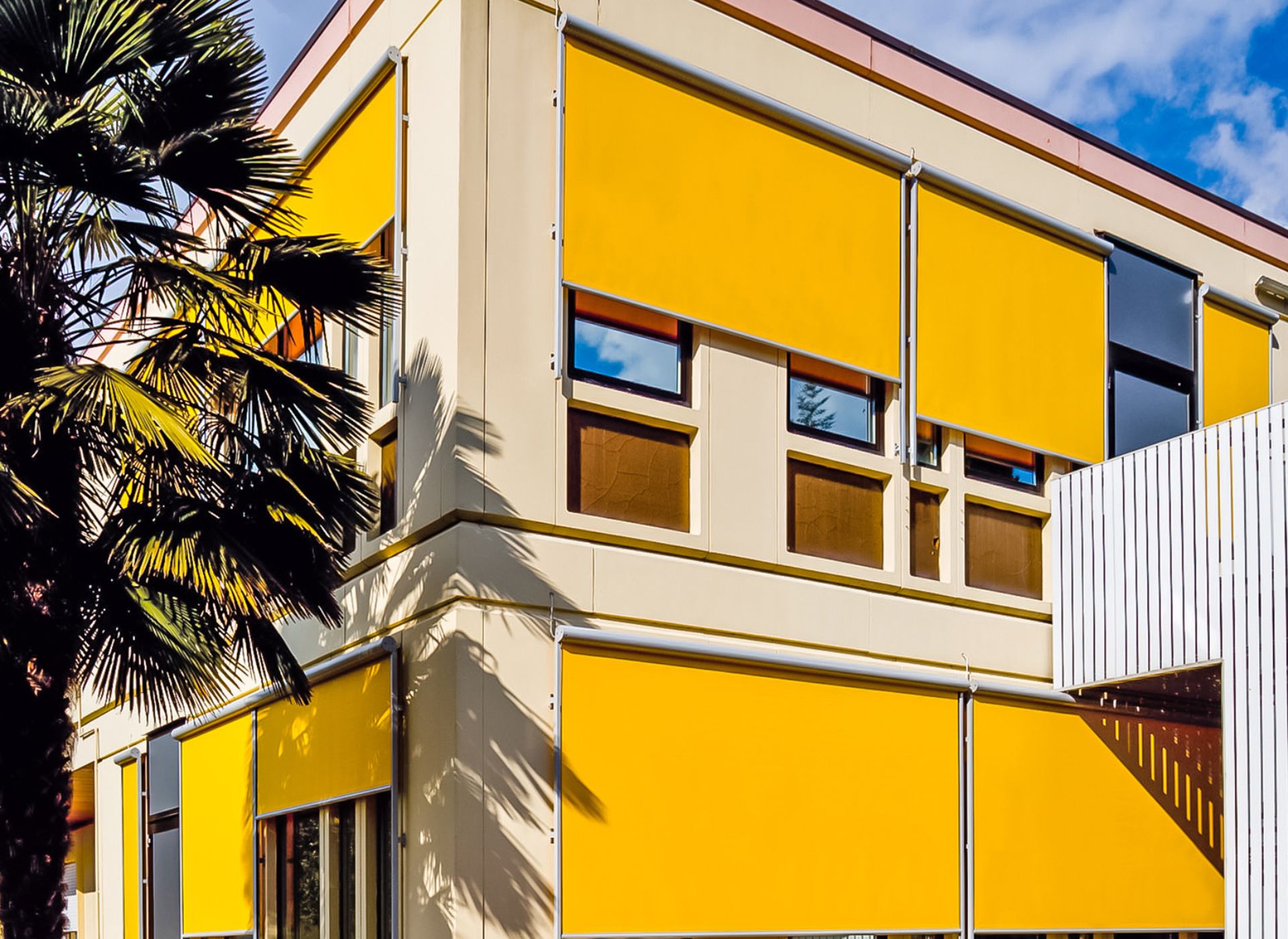 Unsere senkrechte Fassadenmarkisen unterstreichen die Philosophie des Gebäudes mit individueller, angemessener Optik.