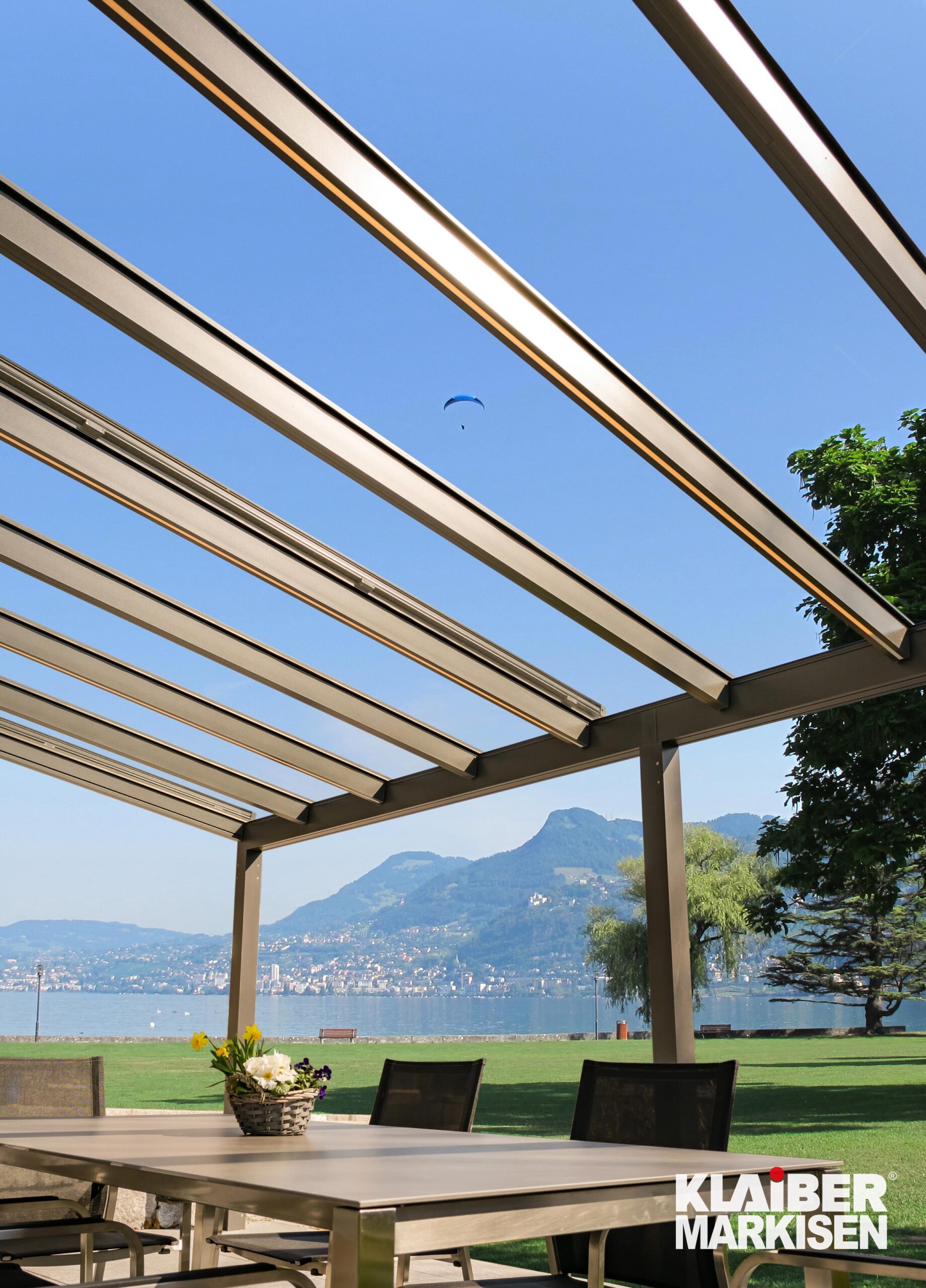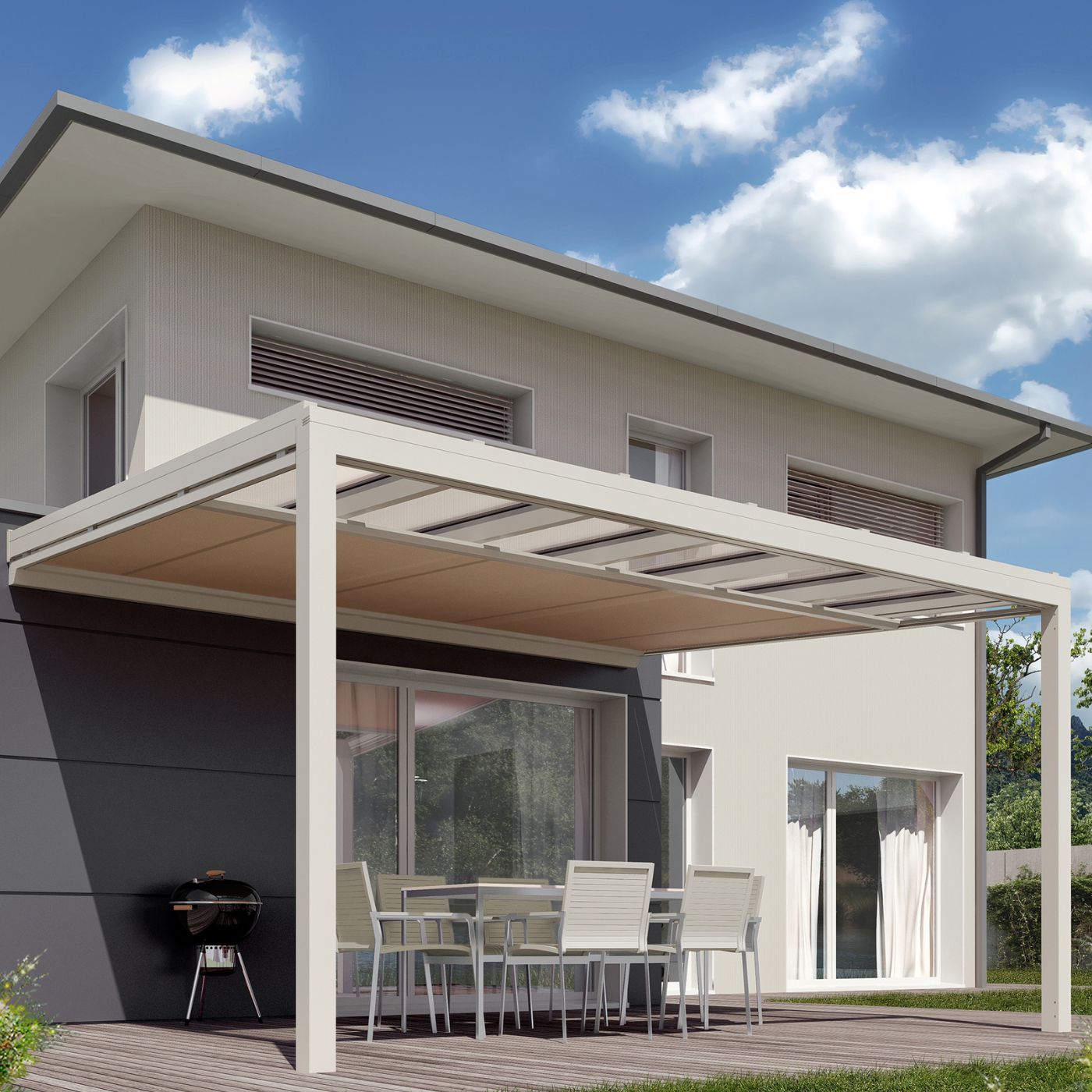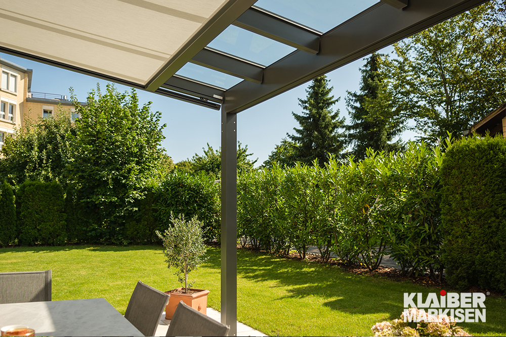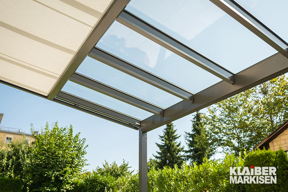 Wir führen verschiedene Glasdachsysteme mit integrierter Markise, die gleichzeitig Sonnen- und Wetterschutz bieten.