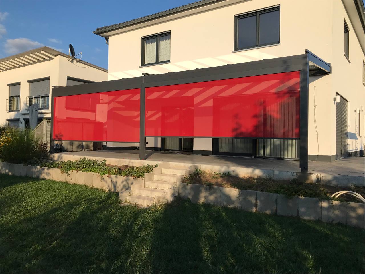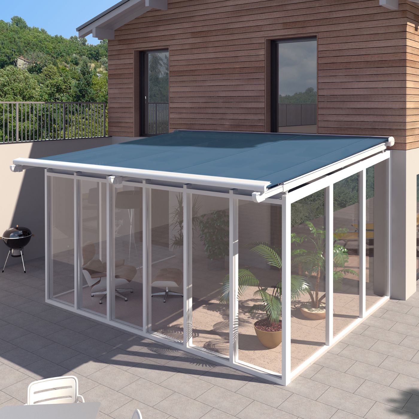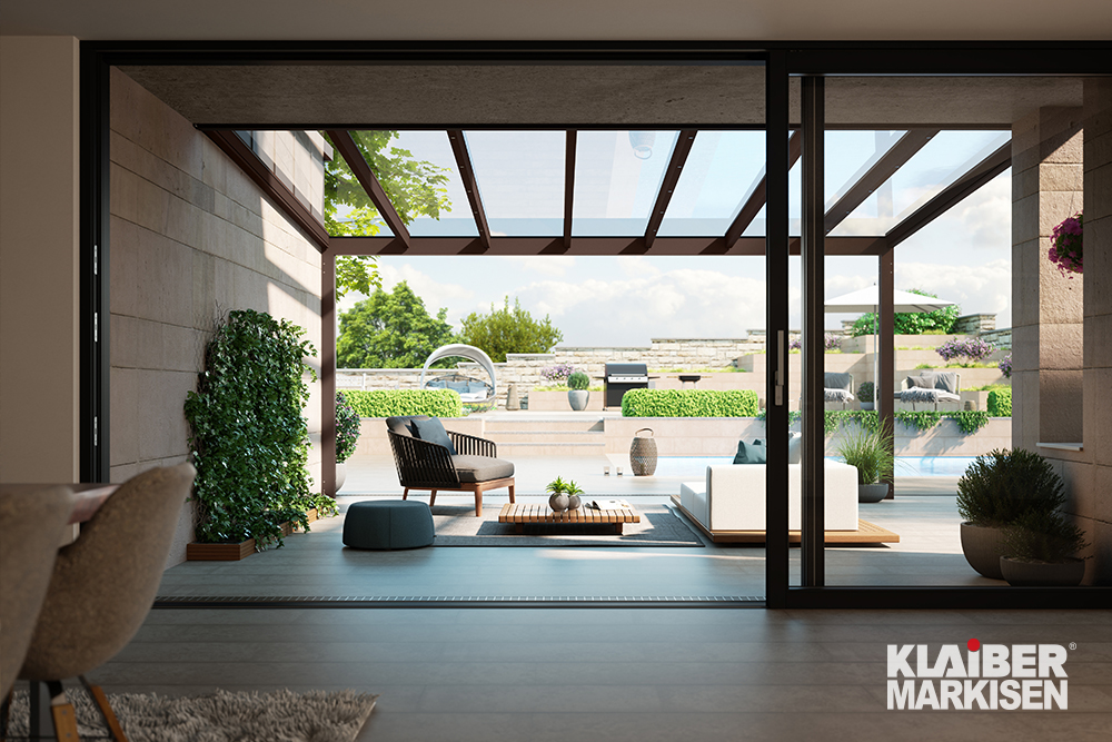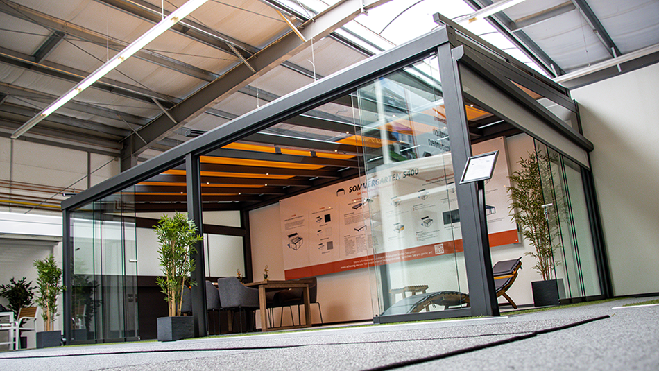 Wir führen verschiedene Glasdachsysteme mit integrierter Markise, die gleichzeitig Sonnen- und Wetterschutz bieten.